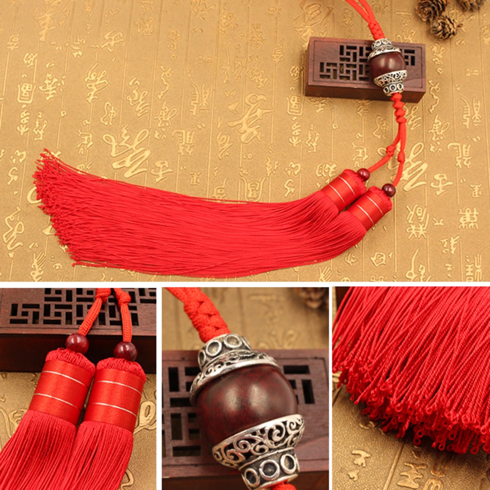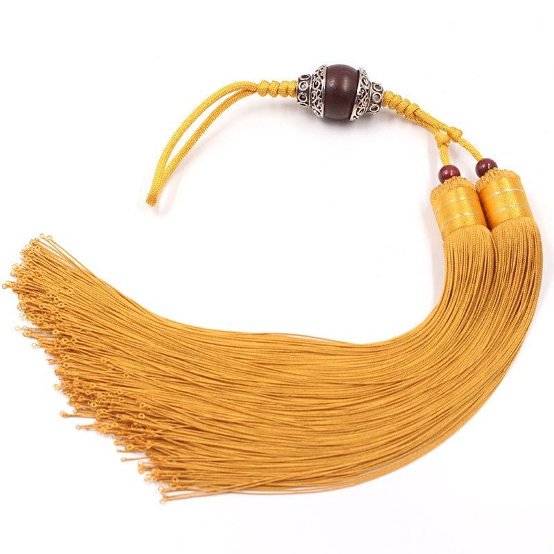 Le Pompon pour épée traditionnelle de tai chi mesure 58 x 32 cm, une longueur qui laisse une frange dense suivre la lame sans s’emmêler. Ses nombreux fils fins, alignés et terminés par de petites boucles, offrent un rendu net et facile à démêler. Le cordon tressé épais et les deux manchons cylindriques assurent un nœud stable au pommeau. Les perles en bois et la grosse perle brun-rouge servent de repère en main. En jaune, en rouge ou en marron, il accompagne les répétitions d’épée taiji.