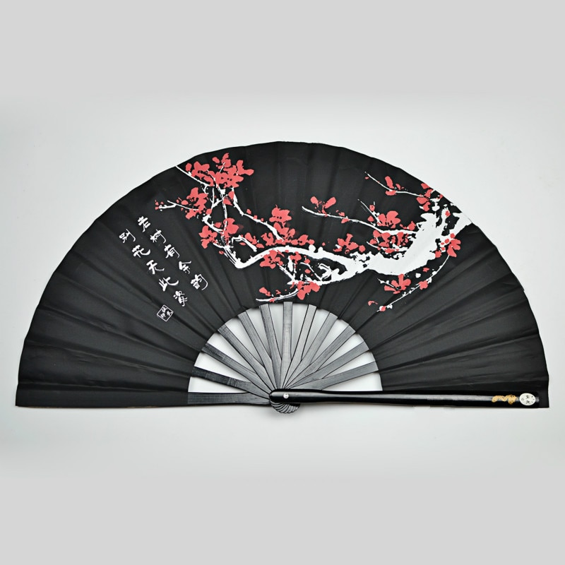 Avec la monture en bambou, les brins fins et le rivet central assurent une ouverture régulière et un bon contrôle du pli. La toile plissée met en valeur des motifs floraux et des calligraphies contrastées, en rouge ou en noir, pour un repère visuel clair. Les dimensions 30 x 20 x 15 cm offrent une large amplitude, et le poids 1,2 kg stabilise la tenue en main. Pour des formes de tai-chi avec éventail.